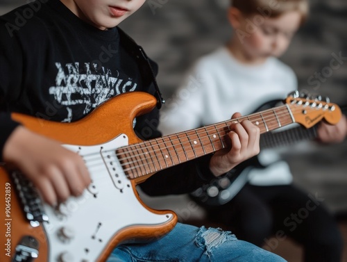 Obraz premium Two boys playing electric guitar, showcasing their musical talent in a...