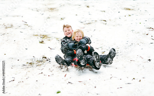 © Caseyjadew, Obraz premium Two boys sharing a toboggan speeding down hill having a great time in the snow