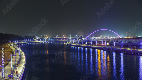 © HyperlapsePro, Obraz premium Two bridges over Dubai canal with a boat crossing under them timelapse.