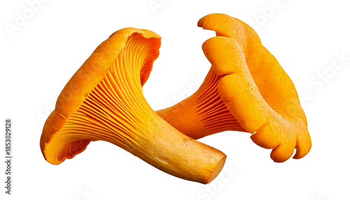 © MDMrl, Fototapeta premium Two bright yellow chanterelle mushrooms, with visible gills and stems, isolated on a transpa.png