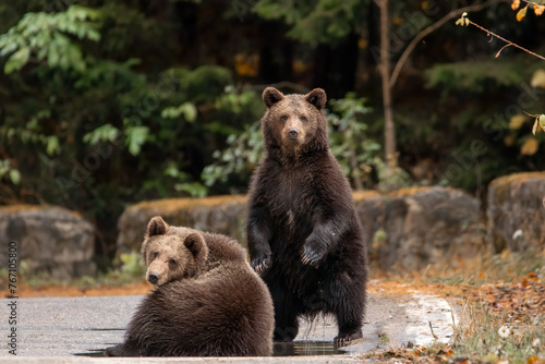 © Mihai, Fototapeta premium Two brown bears cubs playing in the water wildlife photography