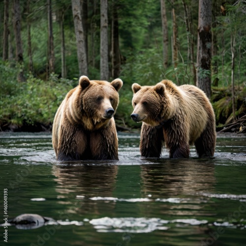© Rahmat, Fototapeta premium Two brown bears in a forest stream