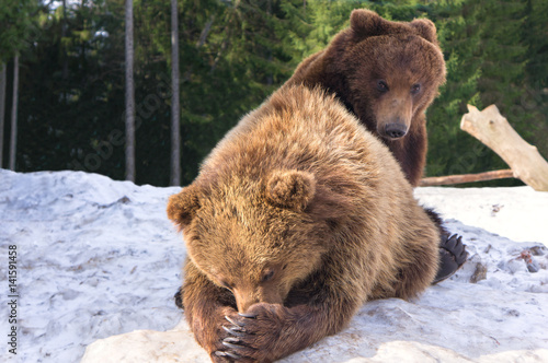 Obraz premium Two brown bears playing outdoors on snow in wild nature forest
