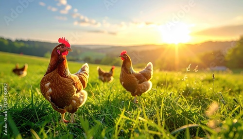 © nurainiamirulging, Obraz premium Two Brown Chickens Grazing in a Lush Green Field During a Golden Sunset with Soft Sunlight Rays and Hills in the Background