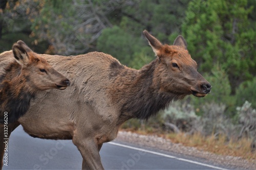 © Ben T., Fototapeta premium Two brown deer cross a street in the usa