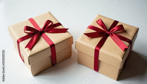 © Mr.Pancho Store, Obraz premium Two Brown Gift Boxes Adorned with Vibrant Red Ribbons and Bows Against a White Background