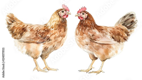 © Berkah, Fototapeta premium Two Brown Hens Facing Each Other Watercolor Painting
