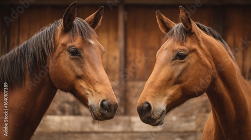 © mila103, Fototapeta premium Two brown horses are standing next to each other in a barn. They are both looking at the camera, and their eyes are closed. The barn is made of wood and has a rustic feel to it