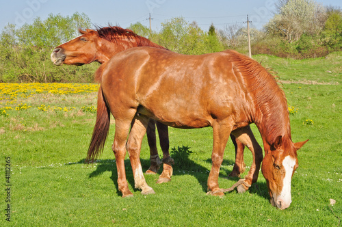© Nadiyka, Fototapeta premium Two brown horses grazing