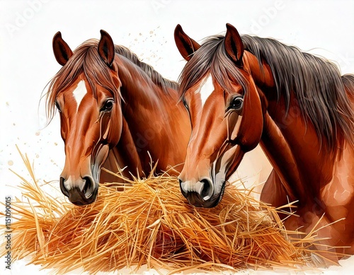 Fototapeta premium Two Brown Horses Grazing on Hay