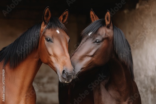 © Aleksandr, Fototapeta premium Two brown horses nuzzling in stable