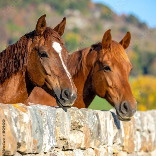 © Beng, Obraz premium Two brown horses peeking over a stone wall
