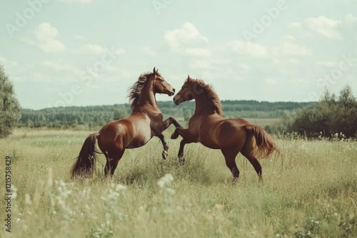 © Dzikrul Husnani, Obraz premium Two Brown Horses Playing in Summer Field