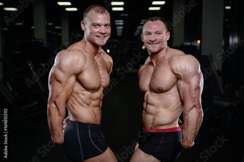 Fototapeta premium Two brutal strong athletic men pumping up muscles and train in gym workout