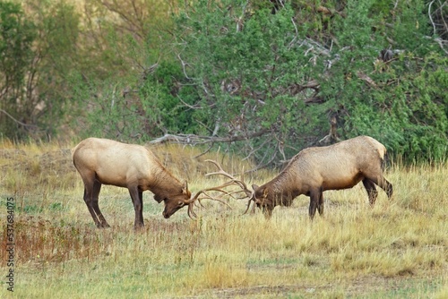 © Gregory Johnston, Fototapeta premium Two bull elk spar during elk rut.