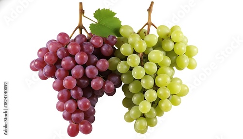 © Umeeia, Fototapeta premium Two bunches of fresh ripe red and green grapes hanging from stems with a single green leaf against a white background