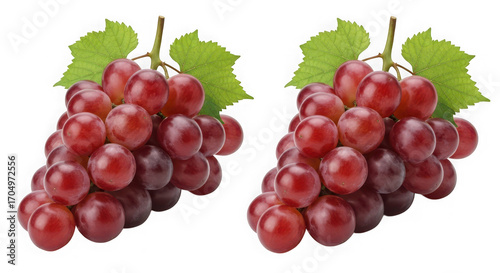 © Md, Fototapeta premium Two bunches of ripe red grapes with green leaves, isolated on transparent background