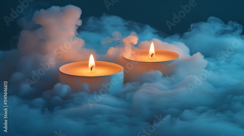 Fototapeta premium Two burning candles with a soft glow in the dark.