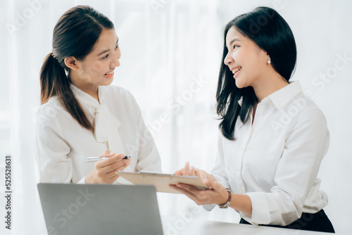 © Kritdanai, Fototapeta premium Two business Asian young women working together with laptop computer in the modern office.
