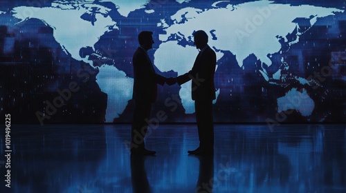 Fototapeta premium Two business people shaking hands in front of a world map backdrop.