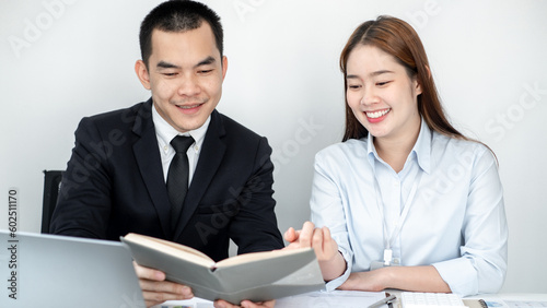 Fototapeta premium Two business people sitting at workplace and discussing about earnings on a...