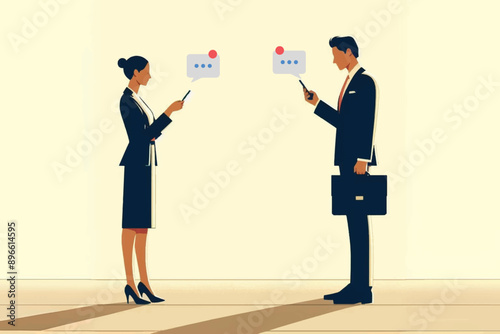 Fototapeta premium Two business professionals in formal attire sending messages on smartphones,...