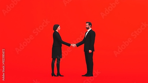 Fototapeta premium Two business professionals shaking hands against a vibrant red background.