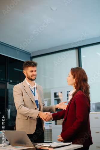 Fototapeta premium Two business professionals shaking hands in an office, symbolizing partnership, success, and teamwork.