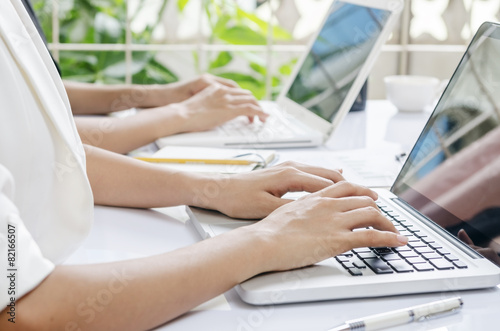 © psphotography, Naklejka premium two business workers typing data in laptop