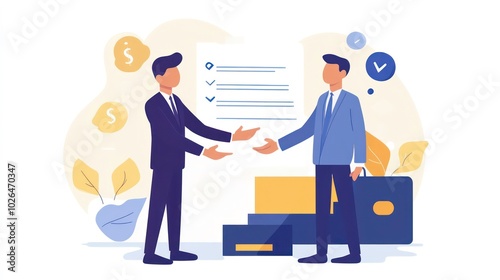 © sablengjago, Obraz premium Two businessmen shaking hands in front of a checklist and stacks of money.