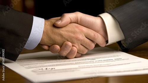 Obraz premium Two businessmen shaking hands over a signed contract.