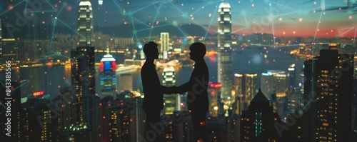 © Denys, Fototapeta premium Two businessmen shaking hands over night cityscape with connection lines