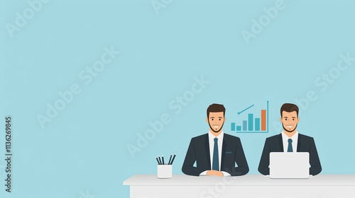 © Eman Suardi, Fototapeta premium Two businessmen sitting at a desk with a laptop and a growth chart in the background.