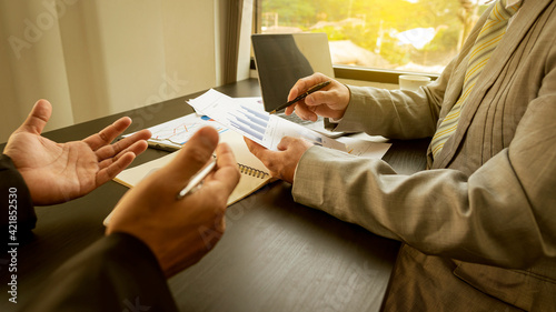 Fototapeta premium Two businessmen talked about graphs and analysis on finance companies and the...