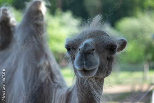 © Wirestock, Fototapeta premium two camels in the shade one looking at the camera
