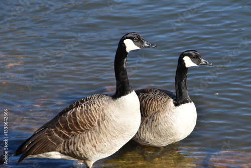 Obraz premium Two Canada geese are standing side by side in water in sunny day in early...