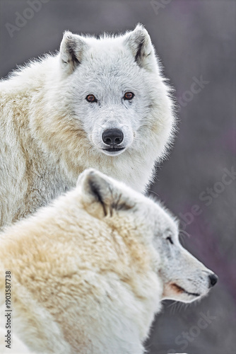 Obraz premium two Canis lupus arctos Arctic wolf portraits in winter with soft background.