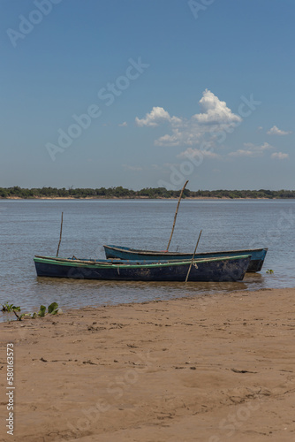 © jroballo, Naklejka premium Two canoes moored on the river bank.