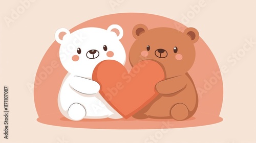 © Irina Kozel, Naklejka premium Two cartoon bears, one white and one brown, holding a heart together against a soft pastel background