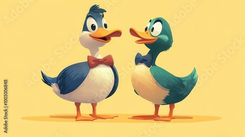 Fototapeta premium Two cartoon ducks wearing bowties looking at each other
