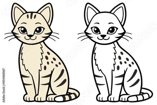Obraz premium Two cartoon serval cats sit side by side, one colored and one outline