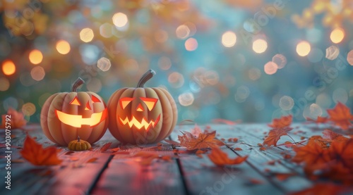 Naklejka premium Two carved pumpkins glow warmly on a rustic wooden table, surrounded by vibrant autumn leaves. The background captures the essence of a magical fall evening with golden hues and a dreamy bokeh effect
