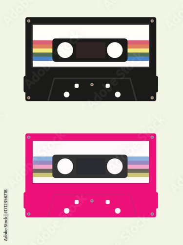 Obraz premium Two cassette tapes, one black with rainbow stripes and one pink, on a light...