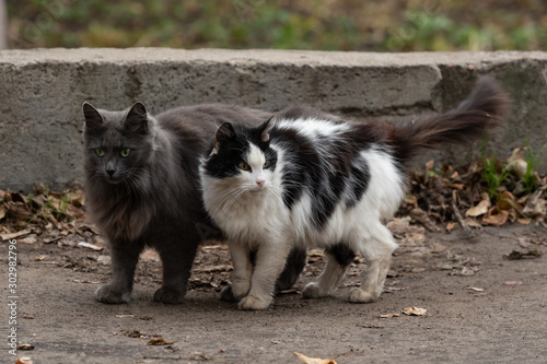 © spritnyuk, Obraz premium two cats siting on the street . grey cat . black and white cat