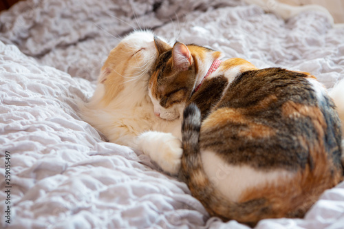 © Cyrena111, Obraz premium two cats sleeping peacefully on bed