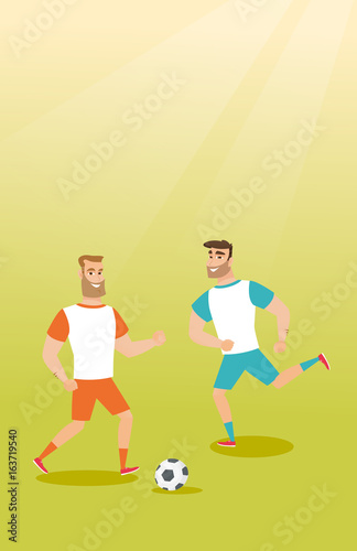 Fototapeta premium Two caucasian soccer players fighting for a ball.
