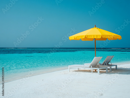 © Aisyaqilumar, Fototapeta premium Two chairs and a yellow umbrella on a pristine white sandy beach overlooking clear turquoise waters under a bright blue sky with fluffy white clouds