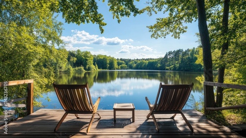 © azi, Fototapeta premium Two chairs on a wooden deck overlooking a serene lake in a lush forest.