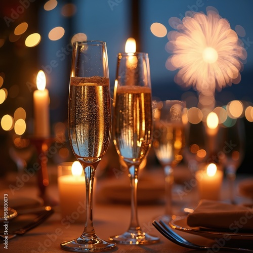 Fototapeta premium Two champagne flutes full of bubbly drink stand on a table set for dinner. Candles flicker softly with bokeh lights and fireworks exploding in night sky.