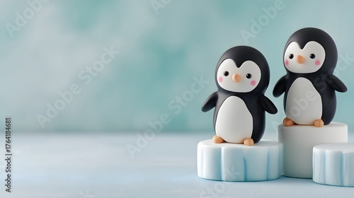 © sungedi, Naklejka premium Two charming, handmade figures of flightless aquatic birds stand on icy platforms with a soft blue background